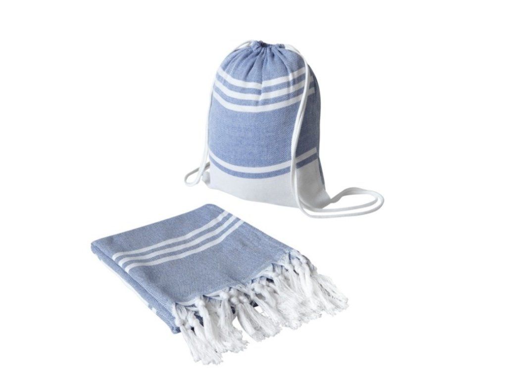 Stylový bavlněný vak s vyšitou výšivkou BO a extra velká plážová osuška / deka v nadčasovém modro-bílém designu.